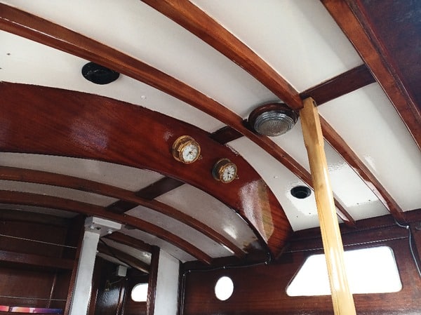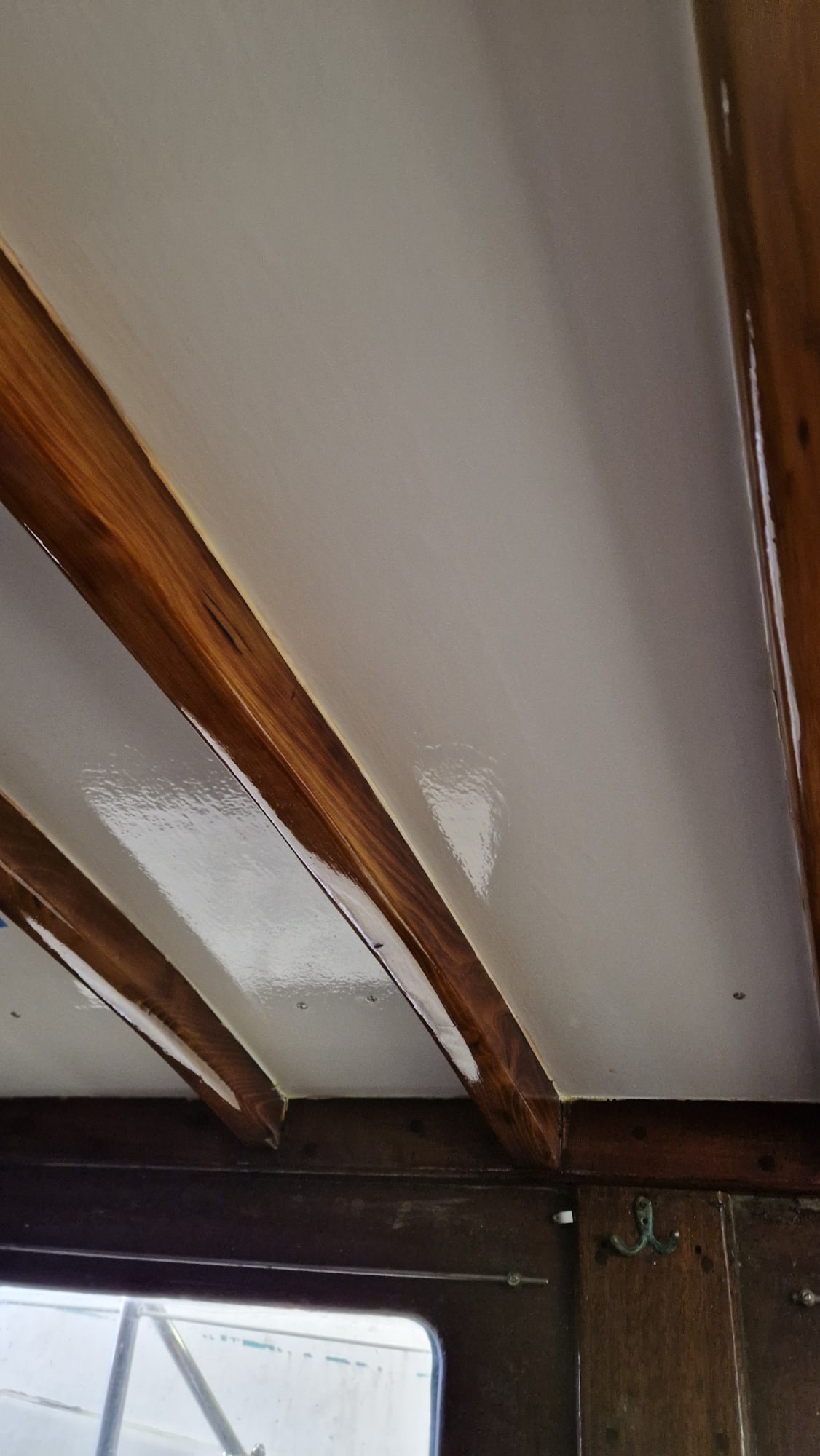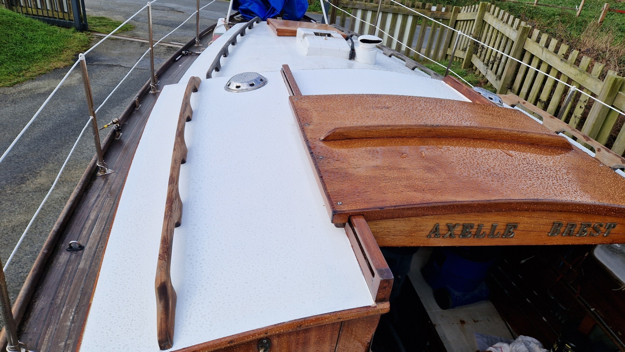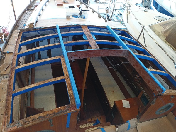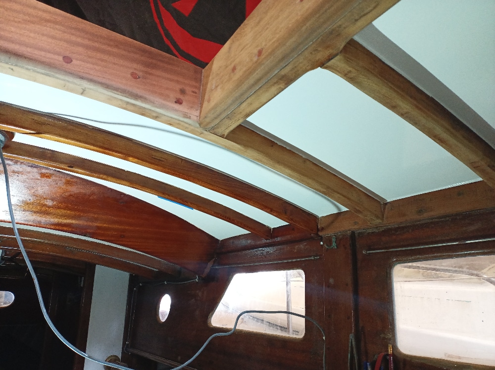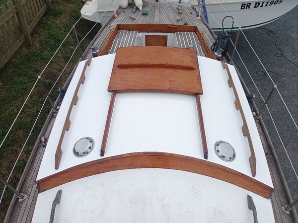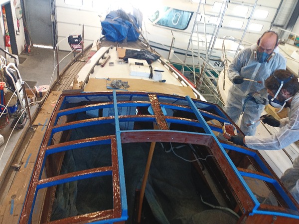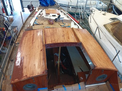 Grosse intervention qui a consisté à déposer l’ancien roof, poncer les barreaux de pont, mettre en forme et coller à l’époxy 3 épaisseurs de contre-plaqué Marine Okoumé, quelques heures de ponçage puis vernis et peintures intérieur et extérieur. De quoi repartir pour quelques années !