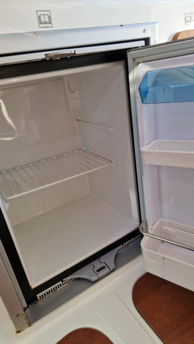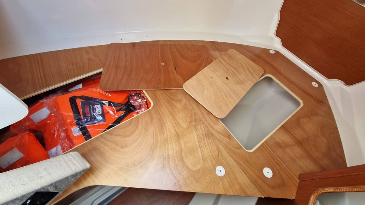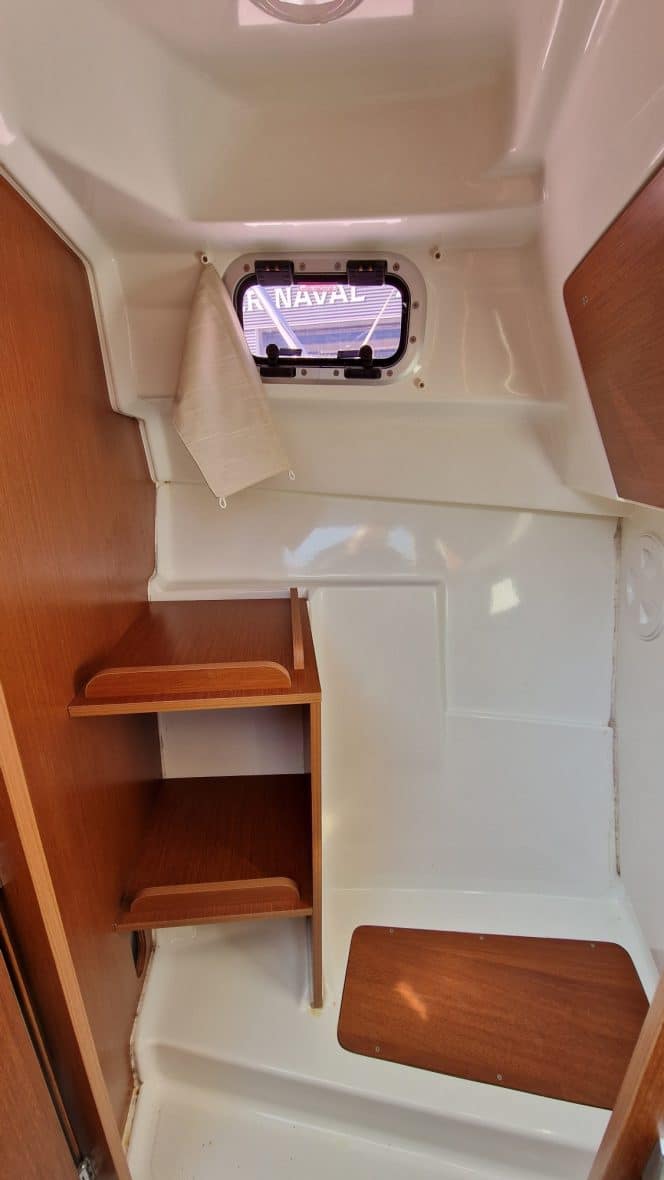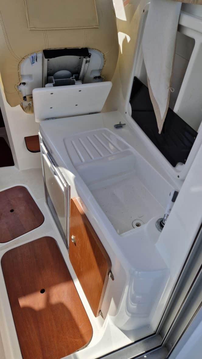 À tribord derrière le poste de pilotage le bateau est doté d'un évier avec une réserve d'eau de 100 litres et d'un frigo ( le bateau est vendu avec un réchaud à cartouche de gaz). À bâbord, une table accueillera tous vos équipiers, cet espace pourra aussi se transformer en couchette 2 places. Les grandes vitre vous offrent une visibilité exceptionnelle. Les nombreux rangements, la hauteur sous barrot de 2.02m vous apportera un bon confort.