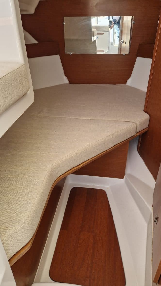 Une courte descente vous amène à la couchette double avant un espace vous permettra d'installer un WC . De nombreux rangements vous permettront d'envisager de passer quelques jours à bord.