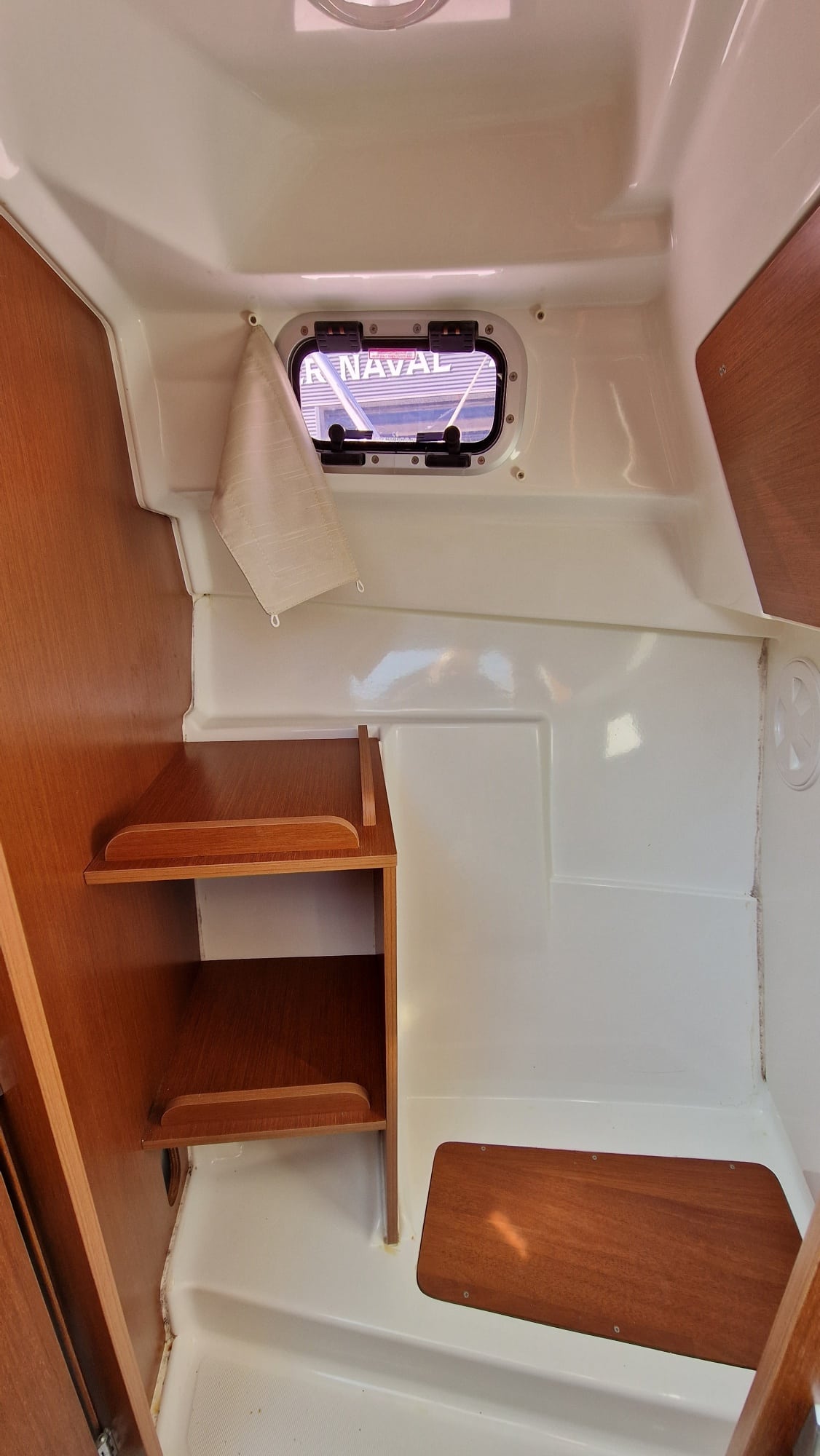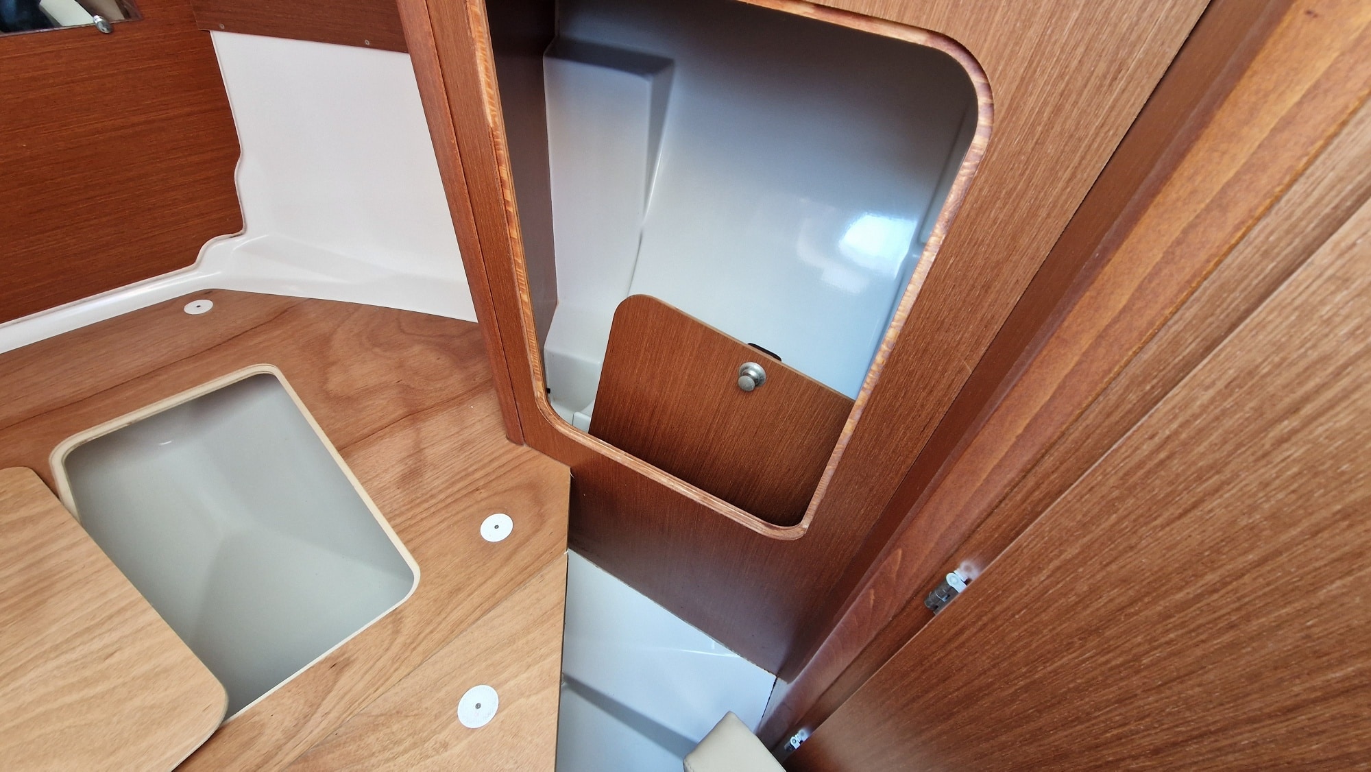 Une courte descente vous amène à la couchette double avant un espace vous permettra d'installer un WC . De nombreux rangements vous permettront d'envisager de passer quelques jours à bord.