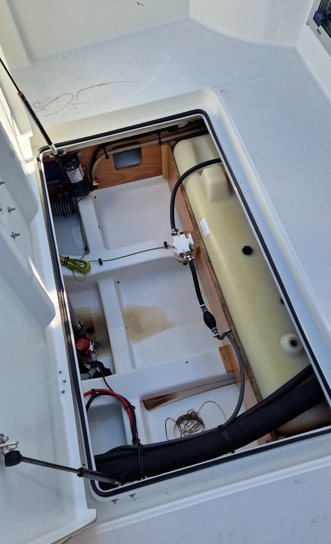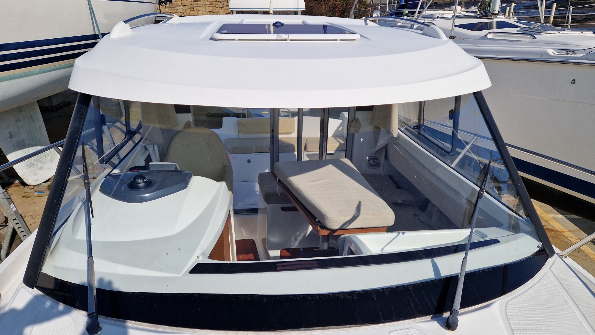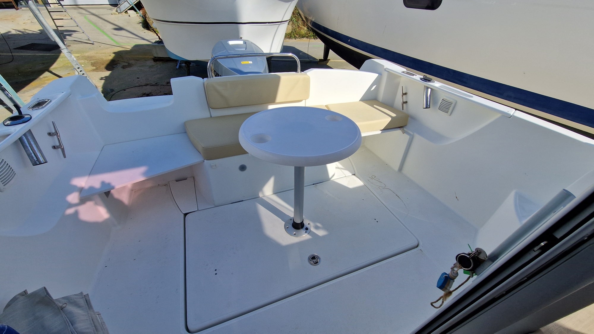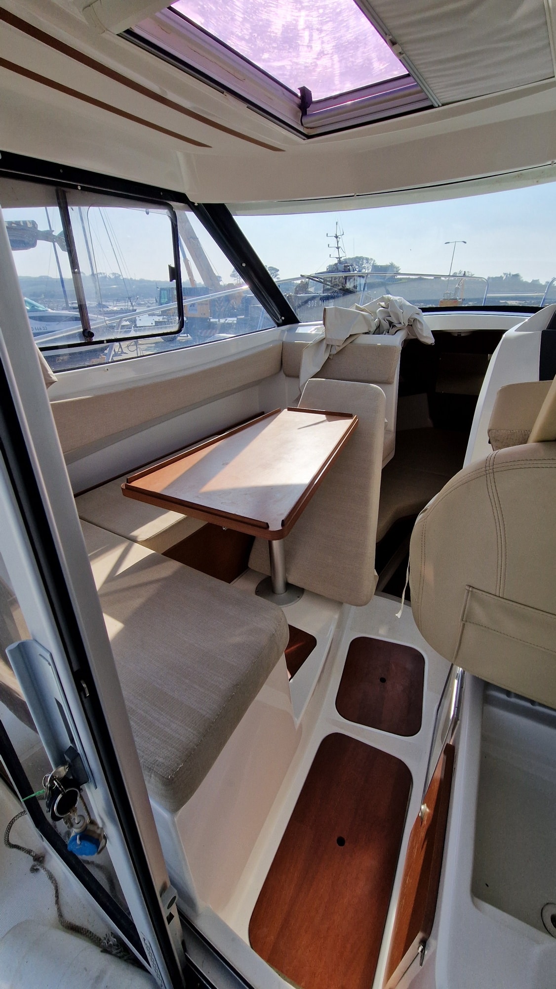 À tribord derrière le poste de pilotage le bateau est doté d'un évier avec une réserve d'eau de 100 litres et d'un frigo ( le bateau est vendu avec un réchaud à cartouche de gaz). À bâbord, une table accueillera tous vos équipiers, cet espace pourra aussi se transformer en couchette 2 places. Les grandes vitre vous offrent une visibilité exceptionnelle. Les nombreux rangements, la hauteur sous barrot de 2.02m vous apportera un bon confort.
